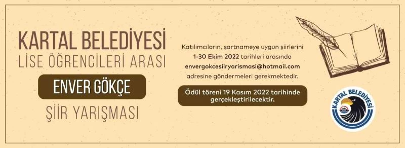 Kartal Belediyesi, kültür-sanat çalışmalarını desteklemek ve yetenekli gençlere fırsat vermek amacıyla ‘Lise Öğrencileri Arası Enver Gökçe Şiir Yarışması’ düzenliyor.