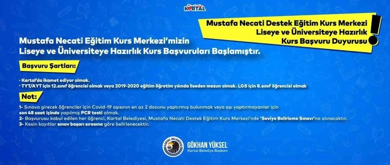 Başvurusu kabul edilen her öğrenci, Kartal Belediyesi Mustafa Necati Destek Eğitim Kurs Merkezi’nde ‘Seviye Belirleme Sınavı’na alınacak. Kesin kayıtlar ise sınav başarı sırasına göre belirlenecek.