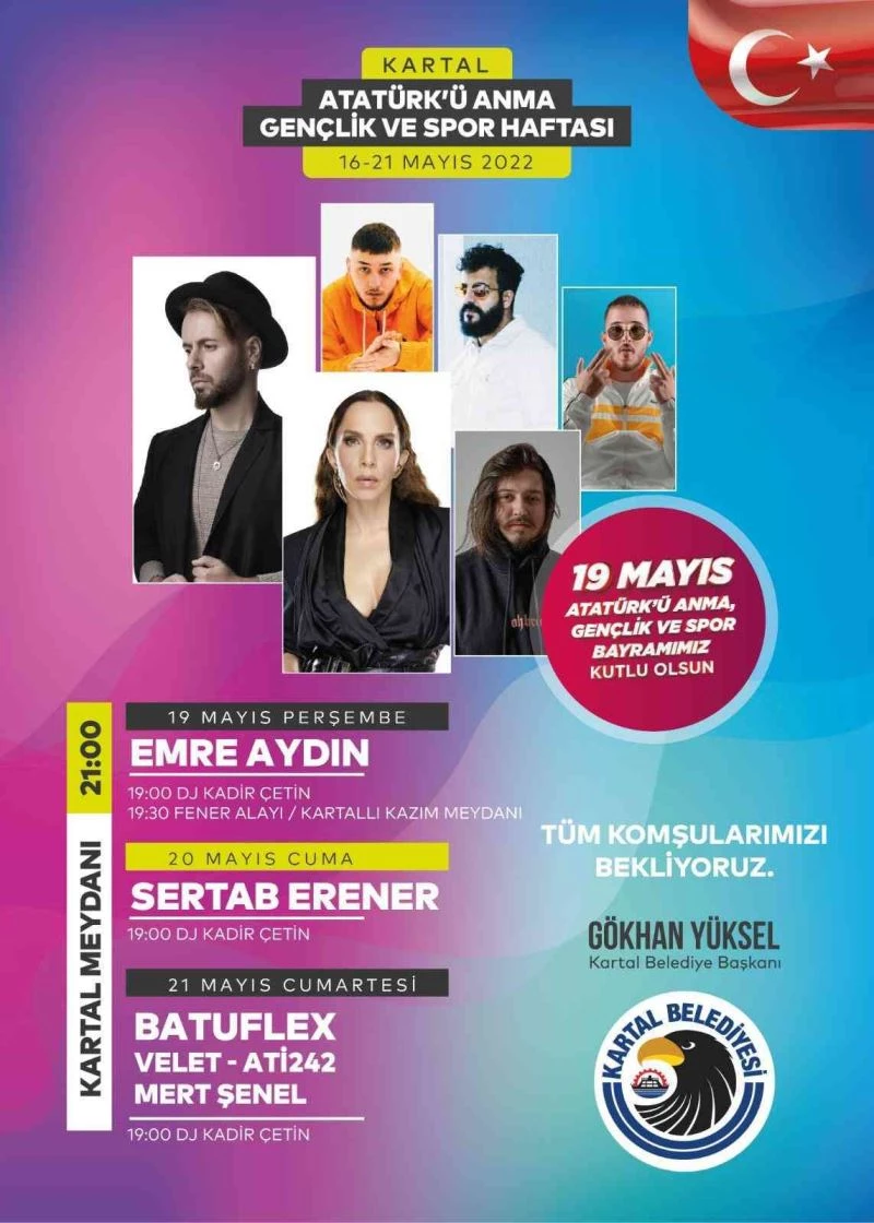 Kartal Belediyesi’nin düzenlediği kutlamalar çerçevesinde Emre Aydın, Sertab Erener ile rap dünyasının sevilen isimleri Batuflex, Velet, Ati242 ve Mert Şenel şarkılarıyla Kartal Meydanı’nda bir dizi konsere imza atacak. Dj Kadir Çetin’in sahne performanslarının da yer alacağı kutlamalar çerçevesinde Kartallılar 19 Mayıs heyecanını üç gün üç gece yaşayacak. 19 Mayıs Perşembe akşamı saat 21.00’de Emre Aydın sahne alırken, 20 Mayıs Cuma akşamı saat 21.00’de Sertab Erener Kartallılar ile buluşacak. 21 Mayıs Cumartesi gecesi ise rap sanatçıları, Kartallı hayranlarına sevilen şarkılarını seslendirecek.