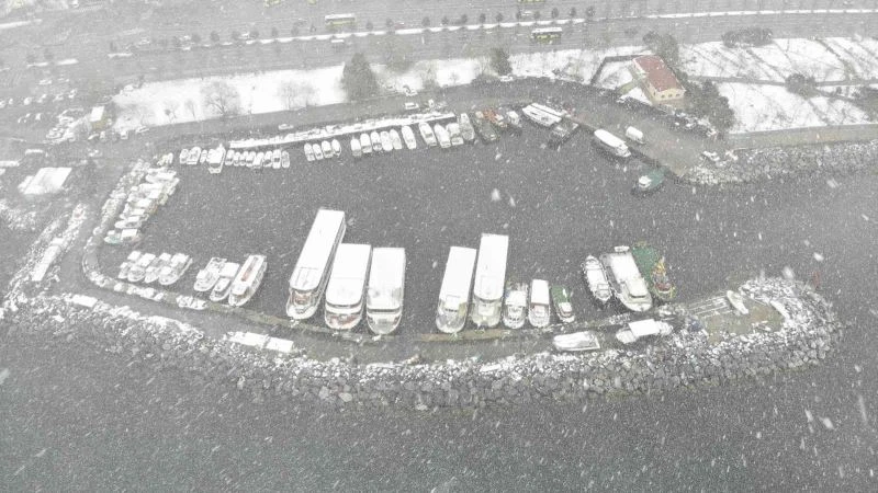 Kartal’da etkisini gösteren kar yağışının ardından sahil şeridi beyaz örtüyle kaplandı. Beyaza bürünen tekneler ve balıkçı barınağı dron ile görüntülendi.