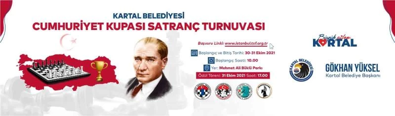 29 Ekim Cumhuriyet Bayramı etkinlikleri kapsamında; Kartal Belediyesi Satranç Akademisi, Türkiye Satranç Federasyonu, Türkiye Satranç Federasyonu İstanbul İl Temsilciliği ve Türkiye Satranç Federasyonu Kartal İlçe Temsilciliği iş birliğinde düzenlenecek olan “Kartal Belediyesi Cumhuriyet Kupası Satranç Turnuvası”, 30 Ekim Cumartesi günü saat 10.00’da Mehmet Ali Büklü Parkı’nda başlayacak. Turnuvanın ödül töreni ise 31 Ekim Pazar günü saat 17.00’de gerçekleştirilecek.