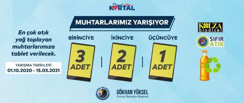 Kartal Belediye Başkanı Gökhan Yüksel’in öncülüğünde çevreyi ve insanı merkeze alan çalışmalar Kartal’da tüm hızıyla devam ediyor. Bu çalışmalar kapsamında 1 Ekim 2020- 15 Mart 2021 tarihleri, Kartal’ın 20 mahallesindeki muhtarlar arasında gerçekleşecek olan çevreci bir yarışmaya sahne olacak. “Muhtarlarımız Yarışıyor” adını taşıyan ve çevre duyarlılığı konusunda mahalle muhtarlarıyla ortak çalışmaların yapılmasını amaçlayan proje ile en çok atık yağ toplayan muhtar üç tablet ile ikinci muhtar iki tablet ile üçüncü muhtar ise bir tablet ile ödüllendirilecek.
