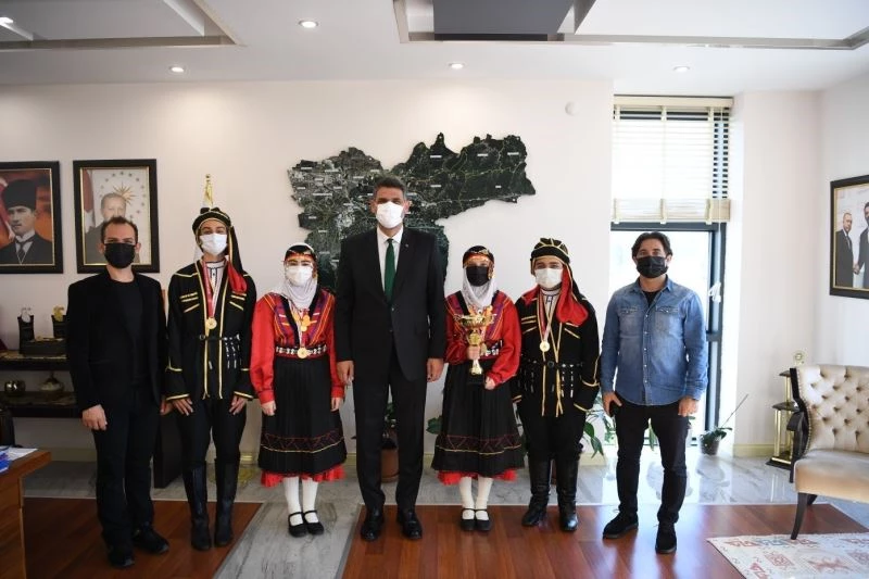 Kartepe Belediye Başkanı Mustafa Kocaman, Kocaeli İl Şampiyonu olan Belediye Halk Dansları Topluluğunu makamında misafir etti.