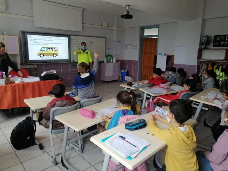 Atatürk İlkokulundaki birinci sınıf öğrencilerine, Emniyet Müdürlüğü ekiplerince trafik farkındalığı eğitimi kapsamında genel kurallar, can güvenliği için ışıklara uyulmasının önemi, servis araçlarına binme ve inme, araçlarda emniyet kemeri kullanma gibi konular anlatıldı.