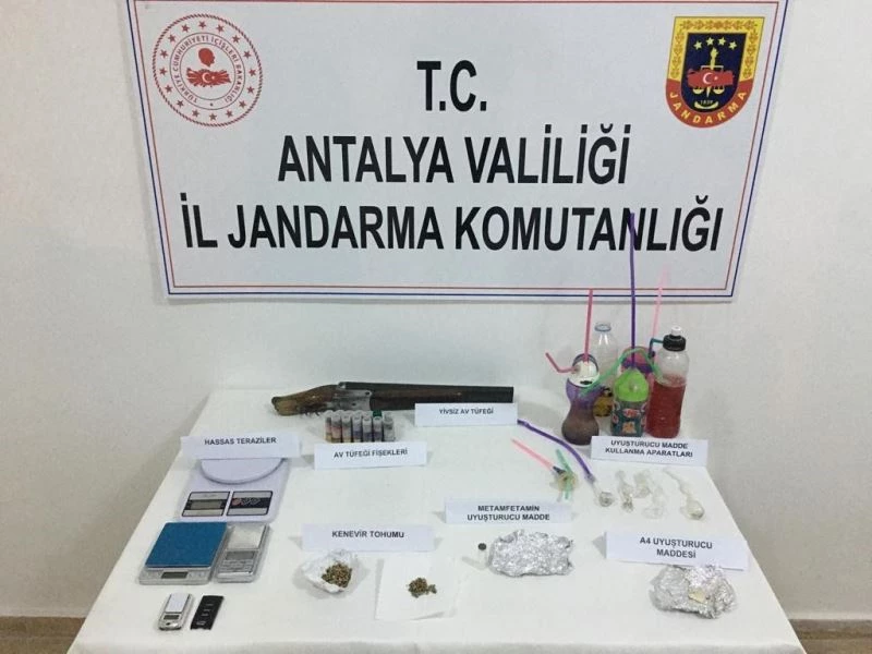 Antalya İl Jandarma Komutanlığına bağlı Kaş İlçe Jandarma Komutanlığı ekipleri Kaş ilçesi, Yeşilköy Mahallesinde 30 Mart Perşembe günü düzenlenen operasyonda H.T ve Y.G. isimli şahısların ikamet adreslerinde yapılan aramada, A4 uyuşturucu madde, 2 gram metamfetamin uyuşturucu madde, 10 adet uyuşturucu madde kullanma aparatı, 20 gram kenevir tohumu, 4 adet hassas terazi, 1 adet yivsiz av tüfeği ile 13 adet av tüfeği fişeği ele geçirildi.
