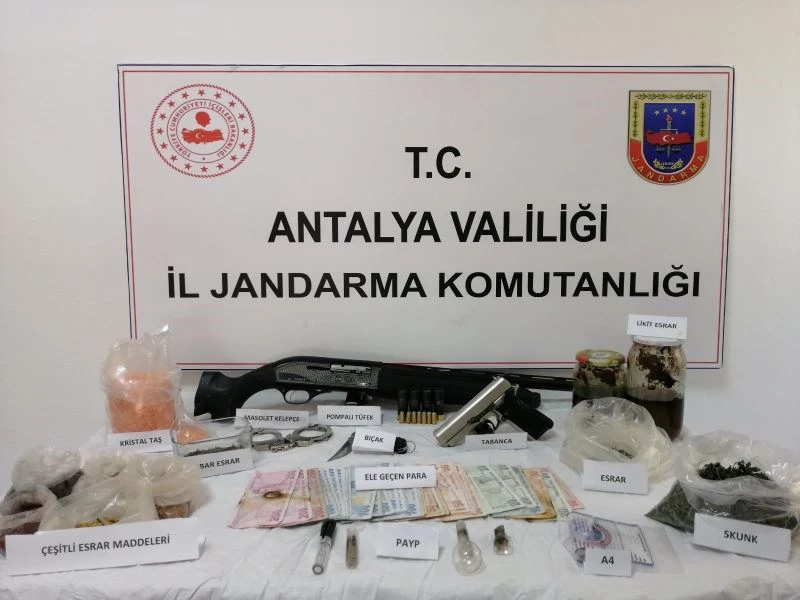 Yapılan kaba üst aramasında şüpheli M.K. isimli şahsın üzerinde 1 adet A4 kağıdına emdirilmiş 3 santim uzunluğunda uyuşturucu madde ile metamfetamin isimli uyuşturucu madde kullanma aparatı olan payp çıkması neticesinde şüpheli şahsın evinde yapılan aramada, 49.9 gr skunk, 1.037 gram uyuşturucu madde ile kullanılan kristal taş, 292.6 gram esrar, 1.456.6 gram likit esrar, 284.5 gr esrar çeşitleri, 3 adet payp, 1 adet ruhsatsız yarı otomatik av tüfeği, 1 adet faturasız kurusıkı tabanca, 1 adet masonet kelepçe, 3 bin 240 TL para ve parçalanmış şekilde çalıntı motosiklet ele geçirildi.