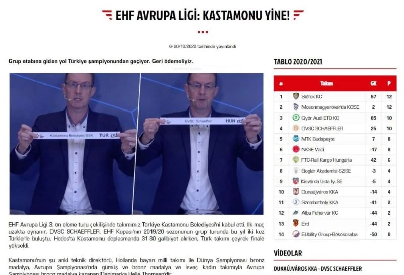Macar ekibi DVSC Schaeffler da kulübün resmi internet sitesinden kurada eşleştikleri Kastamonu Belediyespor ile ilgili açıklama yaptı. Kulübün resmi internet sitesinden ‘EHF Avrupa Ligi: Kastamonu Yine!’ başlığı atan Macar ekibi: “Grup etabına giden yol Türkiye şampiyonundan geçiyor. Geri ödemeliyiz” ifadelerini kullandı.