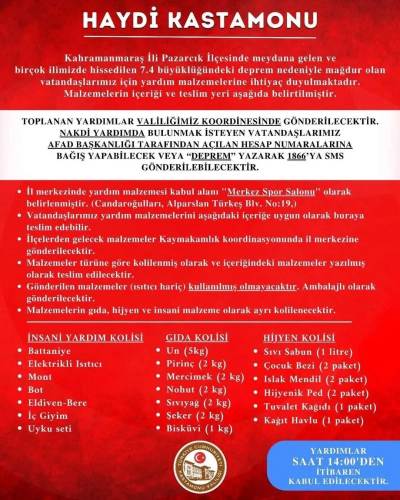 Kastamonu Valiliği tarafından, deprem bölgesindeki vatandaşların acil ihtiyaçlarının karşılanması amacıyla yardım kampanyası başlatıldı.