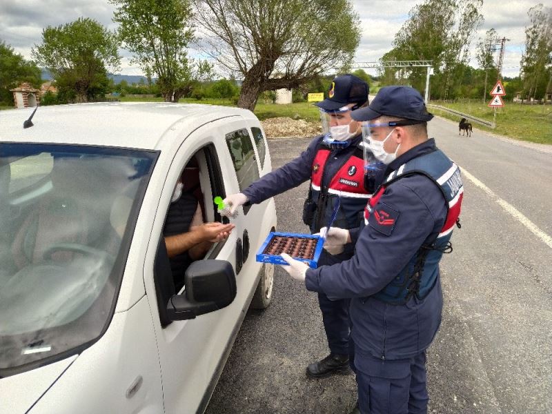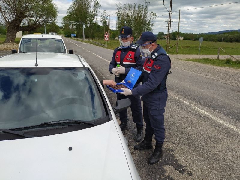 Ramazan Bayramı süresine uygulanan sokağa çıkma kısıtlaması kapsamında alınan tedbirler amacıyla yapılan trafik denetimlerinde jandarma ekipleri, durdurulan araç sürücülerinin bayramını kutlayarak, şeker ve kolonya ikram etti. Ekipler, sürücülere sokağa çıkma yasağı nedeniyle dikkatli olmaları ve alınan tedbirlere uymaları konusunda uyarılarda bulunarak, emniyet kemeri takarak trafik kurallarına uyan vatandaşlara da teşekkür etti. Jandarmanın bu uygulamasından memnun kalan vatandaşlar ekiplere teşekkür ettiler.