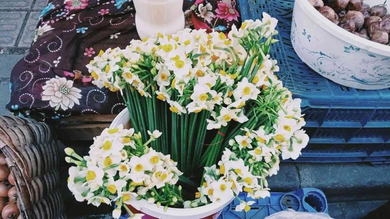 Kastamonu’nun İnebolu ilçesinde salı ve cumartesi günleri kurulan organik semt pazarında, köylünün yetiştirdiği ürünlerin yanı sıra, rengarenk çiçekler tezgahları süsledi. Orman köylerinde ve bahçelerinde toplanan zellangadef (nergis) çiçeği de tezgahlarda yerini aldı. Nergisin demeti 3 ila 5 TL arasında satışa sunuluyor.