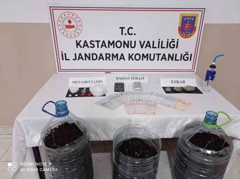Edinilen bilgilere göre, Kastamonu İl Jandarma Komutanlığı İstihbarat Şube Müdürlüğü ve Hanönü İlçe Emniyet Müdürlüğü ekiplerince uyuşturucu madde ticareti yaptığı bilgisine ulaşılan A.A. isimli şahıs takibe alındı. Ekipler tarafından şahsın evine operasyon düzenlendi. Evde yapılan aramalarda 150 gram metamfetamin, 35 gram kubar esrar, 1hassas terazi, 11 kök kenevir, 3 adet esrar, metamfetamin içme aparatı, 8 bin 300 nakit para ve şahsın uyuşturucu madde sattığı kişilerden alacağı para miktarlarının yazılı olduğu kağıt ele geçirildi.