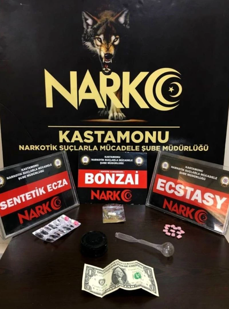 Edinilen bilgilere göre, Kastamonu İl Emniyet Müdürlüğü Narkotik Suçlarla Mücadele Şube Müdürlüğü ekiplerince gerçekleştirilen operasyonda çeşitli miktarlarda extacy hap, reçeteye tabi hap, cannanbionid, uyuşturucu içiminde kullanılan cam düzenek, uyuşturucu öğütümünde kullanılan öğütücü ve 1 adet F serisi dolar ele geçirilmiş olup, olayla ilgili olarak yakalanan 1 şüpheli şahsa adli işlem yapıldı.