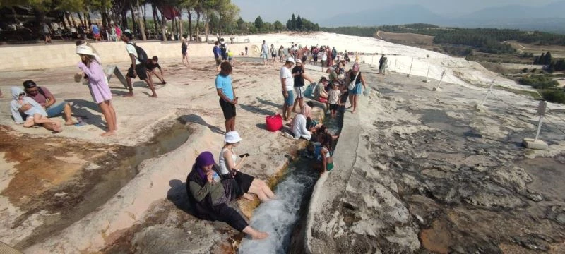 Denizli’de 40 dereceyi bulan kavurucu sıcaklardan kaçan yerli ve yabancı turistler, UNESCO Dünya Miras Listesi’nde yer alan beyaz cennet Pamukkale’ye akın etti.