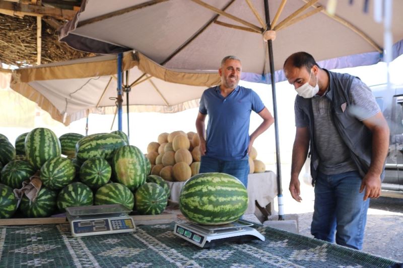 Diyarbakır’da kavurucu sıcakta karayolu üzerinde tezgah açan 42 yaşındaki 4 çocuk babası Edip Çınaklı, burada karpuz satarak ekmek parasını kazanıyor.