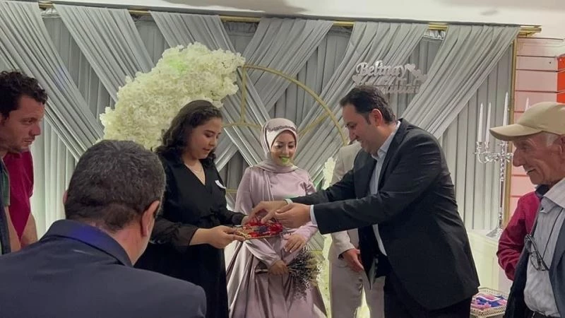 Afyonkarahisar Bolvadin Kaymakamı Taner Bolat katıldığı nişan merasiminde genç çiftin yüzük kurdelesini keserek, çifti tebrik etti .
