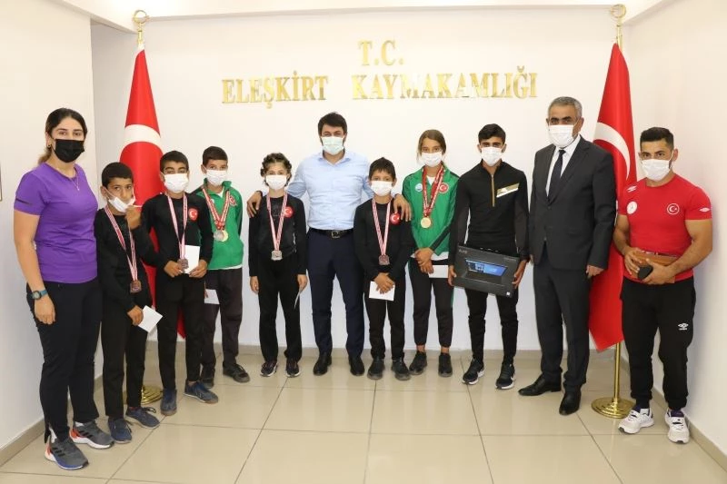 Eleşkirt Gençlik Spor bünyesinde Çıktıkları müsabakalarda Türkiye derecesi elde eden güreş ve atletizm sporcuları; Ağrı Gençlik ve Spor Müdürü İsmail Çalgan ve Eleşkirt Gençlik Spor Müdürü Sabahattin Güzel ile Eleşkirt Kaymakamı Mustafa Duruk’a ziyaret gerçekleştirdi.