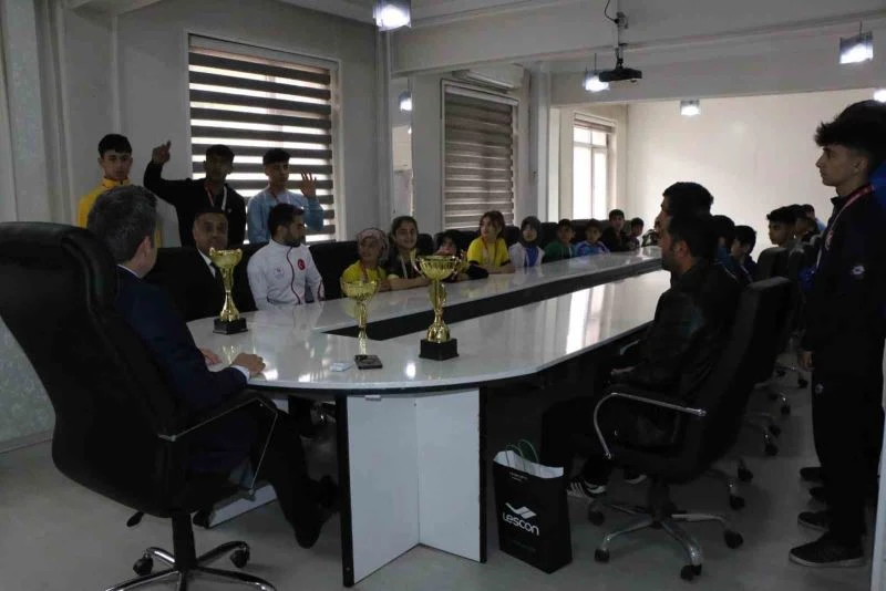 Bitlis’in Hizan Kaymakamı Nurhalil Özçelik, Okul Sporlarında dereceye giren öğrencileri makamında kabul ederek, kendilerini tebrik etti.