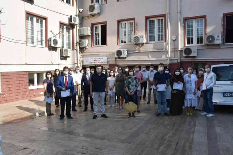 Tüm dünyayı etkisi altına alan ve ülkemizde de görüldüğü günden bugüne 7 binin üzerinde kişinin hayatına mal olan Korona virüs insan sağlığını tehdit etmeye devam ediyor. Korona virüs ile mücadele kapsamında tüm sağlık personeli büyük bir özveri ile çalışırken, Efeler Kaymakamı Cemal Şahin Efeler İlçe Sağlık Müdürlüğü’nü ziyaret ederek filyasyon ekibinde görevli personelleri başarı belgesi ile onurlandırdı.
