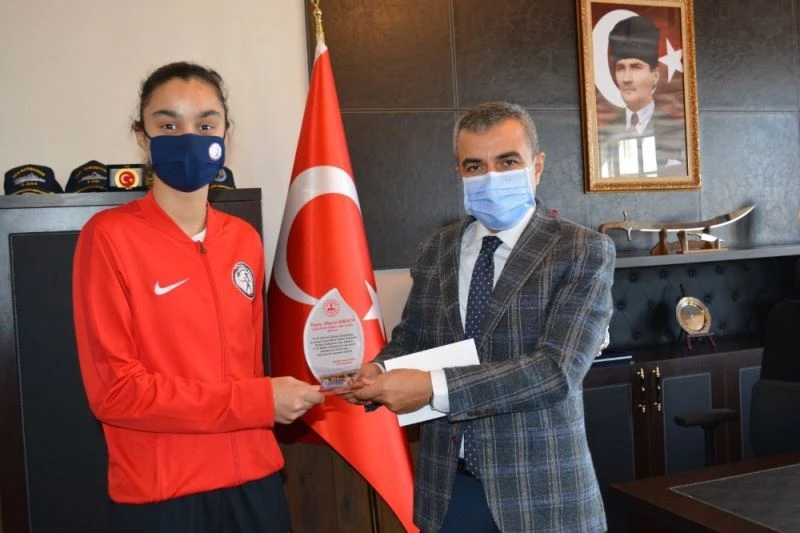 Şampiyon sporcu Aleyna Karaca’yı ve sporcumuzun başarılarında büyük emeği olan Türkiye Atletizm Milli Takım Antrenörü Niyazi Gülhan’ı başarılarından dolayı kutlayan Kaymakam Atasoy, sporcu ve antrenörüne teşekkür plaketi ile dolmakalem hediye etti.