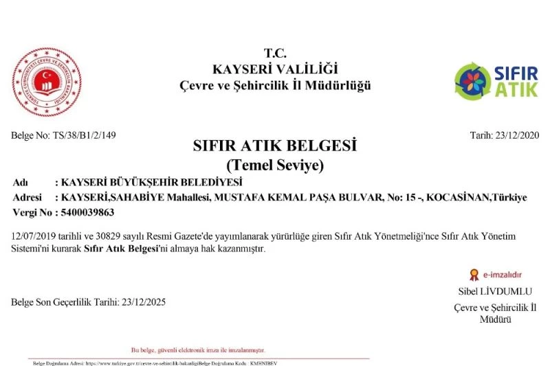 Cumhurbaşkanı Recep Tayyip Erdoğan’ın eşi Emine Erdoğan’ın himayesinde Çevre ve Şehircilik Bakanlığı’nca başlatılan Sıfır Atık Projesi çerçevesinde hizmet binasında örnek belediyecilik sergileyen Kayseri Büyükşehir Belediyesi sıfır atık belgesi aldı.