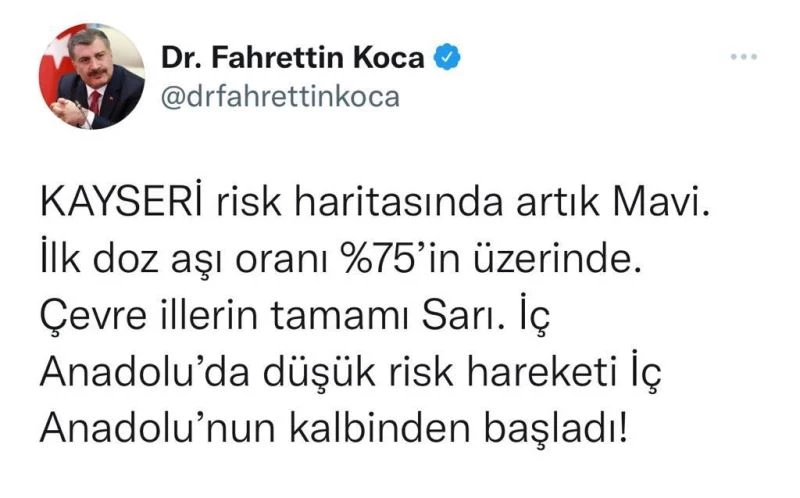 İlk doz aşı oranı yüzde 75 aşılama oranına dönen Kayseri, risk haritasında mavi renge döndü. Sağlık Bakanı Fahrettin Koca, Twitter hesabından yaptığı açıklamada; "Kayseri risk haritasında artık mavi. İlk doz aşı oranı yüzde 75’in üzerinde. Çevre illerin tamamı sarı. İç Anadolu’daki düşük risk hareketi İç Anadolu’nun kalbinde başladı" ifadelerine yer verdi.