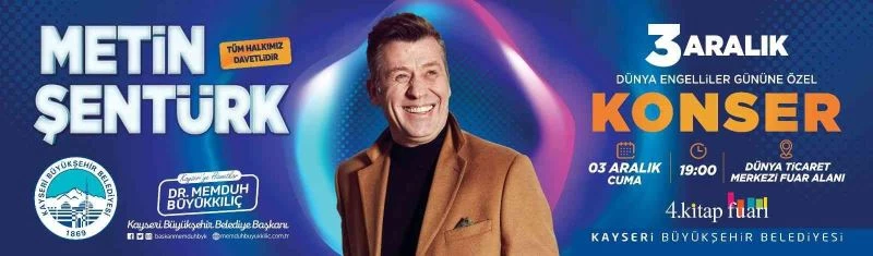 3 Aralık Dünya Engelliler Günü’ne özel düzenlenecek etkinlikte, vatandaşlar hem kitap fuarını ziyaret edecek, hem de konserle keyifli zaman geçirecek. Türkiye’nin sevilen sanatçılarından olan Metin Şentürk’ün konseri 3 Aralık Cuma günü, saat 19.00’da başlayacak. Büyükşehir Belediyesi, okurları, kitap kurtlarını ve tüm Kayserilileri hem fuara hem de konsere davet ediyor.