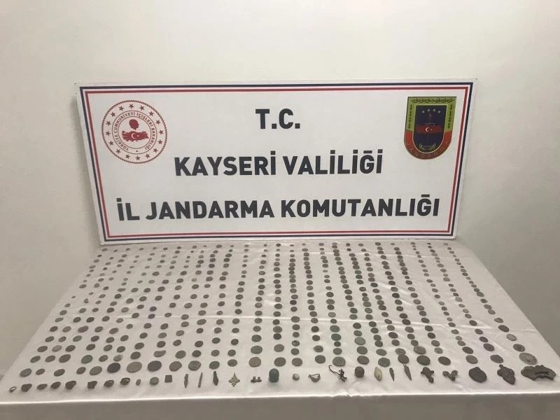 Kayseri İl Jandarma Komutanlığı ekiplerince yapılan çalışmalarda 851 adet Roma ve Bizans Dönemi’ne ait sikke ve 12 adet tarihi obje ele geçirildi.
