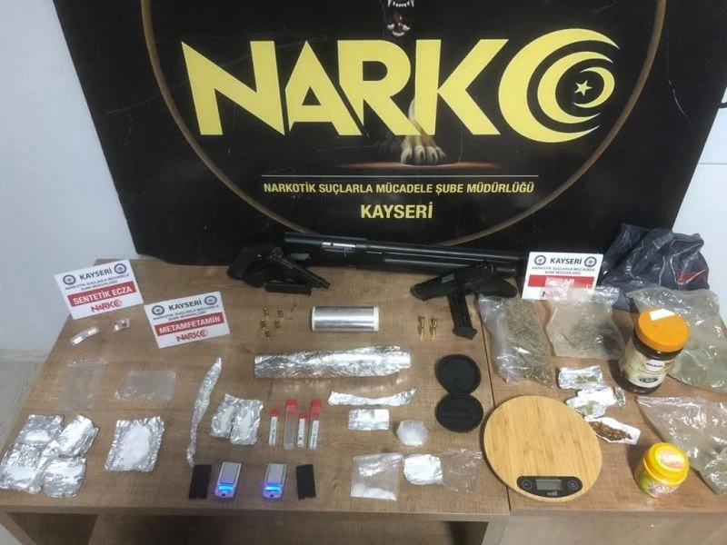 Edinilen bilgiye göre, Kayseri İl Emniyet Müdürlüğü Narkotik Suçlarla Mücadele Şube Müdürlüğü ekipleri, uyuşturucu tacirlerine yönelik operasyon düzenledi. Kocasinan ilçesinde bir araca ve eve operasyona düzenleyen ekipler, B.M., Y.T., Ş.A.C ve S.T.’yi gözaltına aldı. Evde ve otomobilde yapılan aramalarda ise, 2 tabanca, 1 tüfek, 3 hassas terazi, 400 gram satışa hazır uyuşturucu madde ve uyuşturucu madde kullanımında faydalanılan malzemeler ele geçirildi.