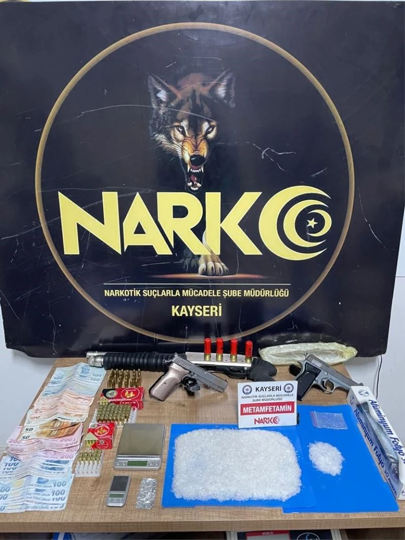 Edinilen bilgiye göre, Narkotik Suçlarla Mücadele Şube Müdürlüğü görevlilerince yapılan çalışmalarda A.Ö. ve M.Ö. isimli şahısların uyuşturucu madde ticareti yaptığı bilgisi üzerine şahıslara ait Hacılar’da bağ evi, Cırgalan’da bağ evi, Talas’ta ikamet, Oymaağaç’ta iş yeri olmak üzere toplam 4 ayrı adrese eş zamanlı operasyon düzenlendi. Operasyonda yapılan aramalarda 2 adet tabanca ve 75 adet fişek, 2 adet hassas terazi, 290.42 gram metamfetamin maddesi, 1 adet pompalı tüfek ve 4 adet pompalı kartuş, 1 adet uyuşturucu paketlemek için kullanılan rulo folyo, suçtan elde edilen gelir kapsamında 4 bin 820 TL ile 100 euro ele geçirildi. A.Ö. ve M.Ö. ’uyuşturucu madde ticareti yapmak’ suçundan gözaltına alındı.