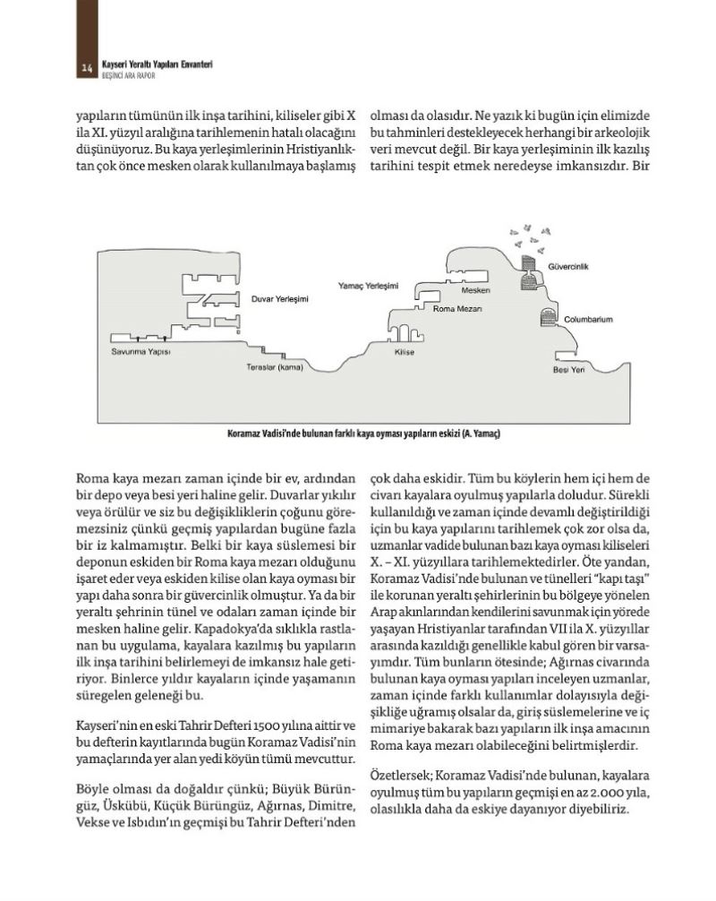 Kayseri Büyükşehir Belediyesi öncülüğünde ÇEKÜL Vakfı ve Obruk Mağara Araştırma Grubu’nun ortaklığında Kayseri’deki yeraltı yapılarının envanterini çıkarmaya yönelik 2013 yılında başlayan çalışmalar devam ediyor. Araştırma ekibi tarafından her yılın sonunda hazırlanan ve bu yılda 5’inci kez sunulan raporda UNESCO Dünya Mirası Geçici Listesi’ne giren Koramaz Vadisi’nin zenginliği gözler önüne serildi.