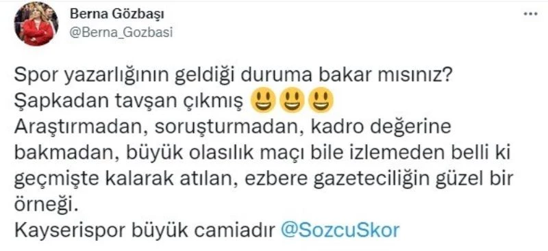 Yukatel Kayserispor Başkanı Berna Gözbaşı, Süper Lig’in 3.haftasında deplasmanda Medipol Başakşehir ile karşılaşan ve müsabakayı 1-0 kazanan takımının galibiyetinin tesadüf olarak addedilmesine tepki gösterdi. Yukatel Kayserispor Başkanı Berna Gözbaşı; ’Şapkadan tavşan çıktı’ şeklinde attığı başlığa tepki göstererek sosyal paylaşım sitesindeki hesabı üzerinden; "Spor yazarlığının geldiği duruma bakar mısınız? Şapkadan tavşan çıkmış! Araştırmadan, soruşturmadan, kadro değerine bakmadan, büyük ihtimalle maçı bile izlemeden belli ki geçmişte kalarak atılan, ezbere gazeteciliğin güzel bir örneği. Kayserispor büyük camiadır" cümleleri ile cevap verdi.