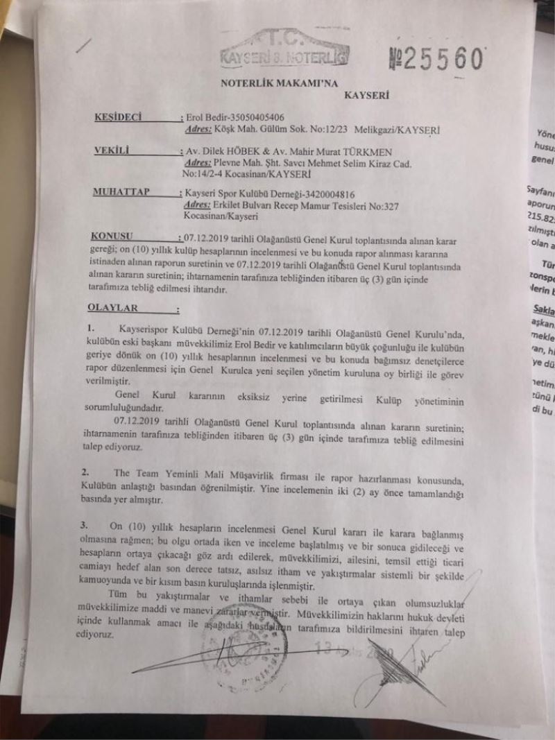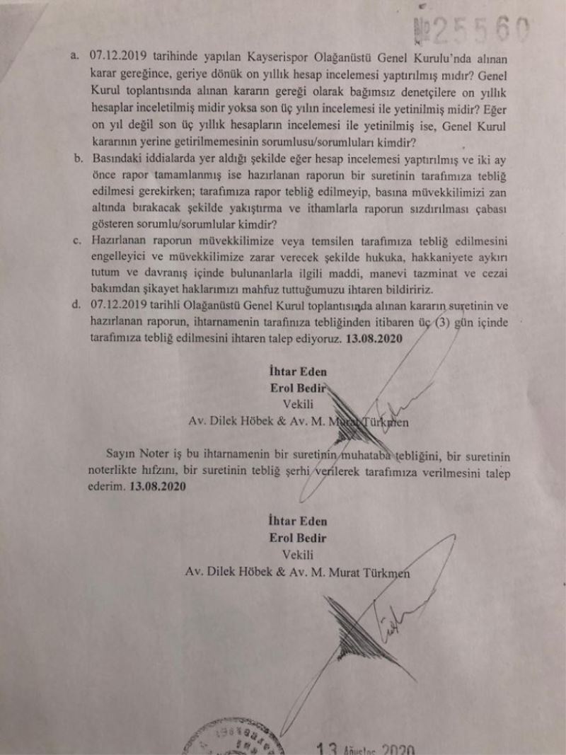 Hes Kablo Kayserispor eski Başkanı Erol Bedir, avukatı Dilek Höbek ve Mahir Murat Türkmen’in hazırladığı ihtarnameyi Kayseri 3.Noter kanalıyla sarı kırmızılı kulübe gönderdi. İhtarnamede, "7 Aralık 2019 tarihinde yapılan Kayserispor Olağanüstü Genel Kurulu’nda alınan karar gereğince, geriye dönük 10 yıllık hesap incelemesi yaptırılmış mıdır? Genel kurul toplantısında alınan kararın gereği olarak bağımsız denetçilere 10 yıllık hesap inceletilmiş midir yoksa son 3 yılın incelemesi ile yetinilmiş midir? Eğer 10 yıl değil son 3 yıllık hesapların incelemesi ile yetinilmiş ise, Genel Kurul kararının yerine getirilmemesinin sorumlusu/sorumluları kimdir? Basında iddialarda yeraldığı şekilde eğer hesap incelemesi yaptırılmış ve 2 ay önce rapor tamamlanmış ise hazırlanan raporun bir suretinin tarafımıza tebliğ edilmeyip, basına müvekkilimizi zan altında bırakacak şekilde yakıştırma ve ithamlarla raporun sızdırılması çabası gösteren sorumlu/sorumlular kimdir? Hazırlanan raporun müvekkilimize veya temsilen tarafımıza tebliğ edilmesini engelleyici ve müvekkilimize zarar verecek şekilde hukuka, hakkaniyete aykırı tutum ve davranış içinde bulunanlarla ilgili maddi, manevi tazminat ve cezai bakımdan şikayet haklarımızı mahfuz tuttuğumuzu ihtaren bildiririz" cümlelerine yer verildi.