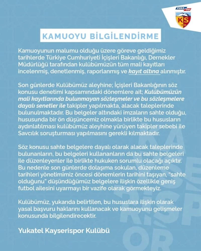 Süper Lig takımlarından Yukatel Kayserispor Kulübü, kamuoyuna sahte senet düzenlendiği yönünde düşünce hasıl olduğuna dair açıklama yaptı. Sarı kırmızılı kulübün resmi internet sitesinden yapılan açıklamada "Kamuoyunun malumu olduğu üzere göreve geldiğimiz tarihlerde Türkiye Cumhuriyeti İçişleri Bakanlığı, Dernekler Müdürlüğü tarafından kulübümüzün tüm mali kayıtları incelenmiş, denetlenmiş, raporlanmış ve kayıt altına alınmıştır. Son günlerde Kulübümüz aleyhine; İçişleri Bakanlığının söz konusu denetimi kapsamındaki dönemlere ait; Kulübümüzün mali kayıtlarında bulunmayan sözleşmeler ve bu sözleşmelere dayalı senetler ile takipler yapılmakta, alacak taleplerinde bulunulmaktadır. Bu belgeler altındaki imzaların sahte olduğu, hususunda bir ön düşüncemiz olmakla birlikte bu hususların aydınlatılması kulübümüz aleyhine yürüyen takipler sebebi ile Savcılık soruşturması yapılmasını gerekli kılmaktadır" denildi.