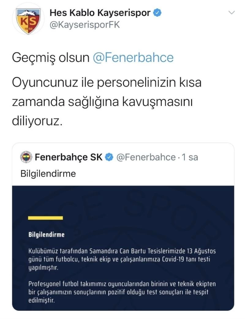 Hes Kablo Kayserispor, futbolcu ve teknik ekip personelinde korona virüs (covid-19) testi sonucu pozitif çıkan Fenerbahçe için geçmiş olsun mesajı yayımladı.