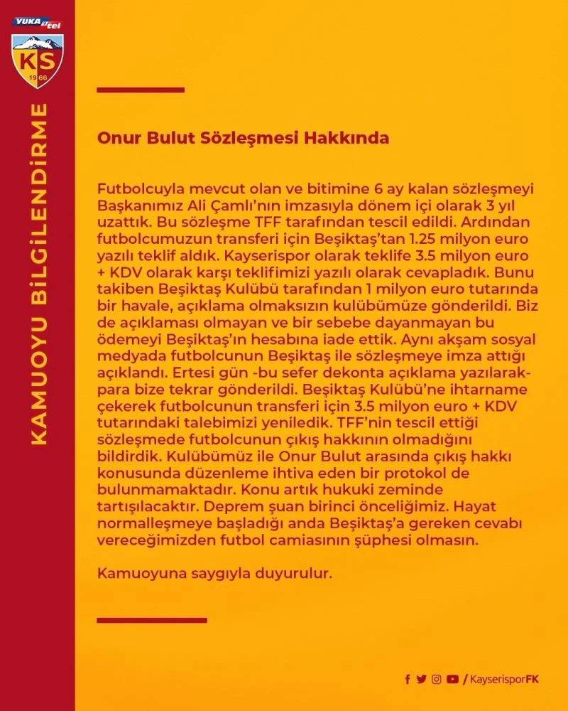Yapılan açıklamada, transferle ilgili Beşiktaş’tan gelen teklife 3.5 milyon Euro ve KDV olarak cevap verdiklerini, Beşiktaş’tan ise 1 milyon Euro tutarında bir havale yapıldığı bildirilerek yatırılan paranın yeniden iade edildiği bildirildi. Açıklamada; "Futbolcuyla mevcut olan ve bitimine 6 ay kalan sözleşmeyi Başkanımız Ali Çamlı’nın imzasıyla dönem içi olarak 3 yıl uzattık. Bu sözleşme TFF tarafından tescil edildi. Ardından futbolcumuzun transferi için Beşiktaş’tan 1.25 milyon euro yazılı teklif aldık. Kayserispor olarak teklife 3.5 milyon euro + KDV olarak karşı teklifimizi yazılı olarak cevapladık. Bunu takiben Beşiktaş Kulübü tarafından 1 milyon euro tutarında bir havale, açıklama olmaksızın kulübümüze gönderildi. Biz de açıklaması olmayan ve bir sebebe dayanmayan bu ödemeyi Beşiktaş’ın hesabına iade ettik. Aynı akşam sosyal medyada futbolcunun Beşiktaş ile sözleşmeye imza attığı açıklandı. Ertesi gün -bu sefer dekonta açıklama yazılarak- para bize tekrar gönderildi. Beşiktaş Kulübü’ne ihtarname çekerek futbolcunun transferi için 3.5 milyon euro + KDV tutarındaki talebimizi yeniledik. TFF’nin tescil ettiği sözleşmede futbolcunun çıkış hakkının olmadığını bildirdik. Kulübümüz ile Onur Bulut arasında çıkış hakkı konusunda düzenleme ihtiva eden bir protokol de bulunmamaktadır. Konu artık hukuki zeminde tartışılacaktır. Deprem şuan birinci önceliğimiz. Hayat normalleşmeye başladığı anda Beşiktaş’a gereken cevabı vereceğimizden futbol camiasının şüphesi olmasın" ifadelerine yer verildi.