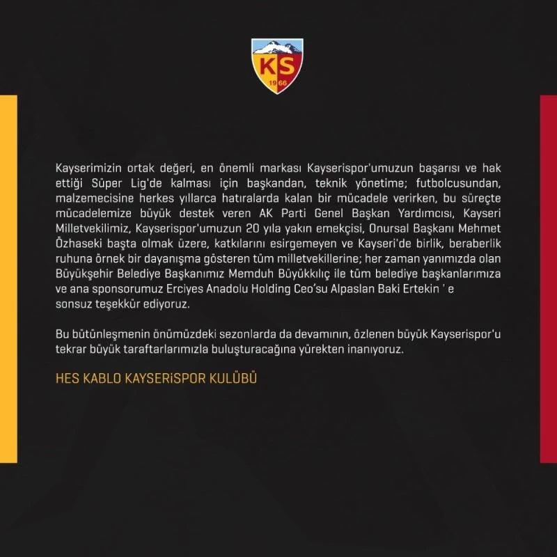 Hes Kablo Kayserispor Kulübü yaptığı paylaşımda, “Kayserimizin ortak değeri, en önemli markası Kayserispor’umuzun başarısı ve hak ettiği Süper Lig’de kalması için başkandan, teknik yönetime, futbolcusundan, malzemecisine herkes yıllarca hatıralarda kalan bir mücadele verirken, bu süreçte mücadelemize büyük destek veren AK Parti Genel Başkan Yardımcısı, Kayseri Milletvekilimiz, Kayserispor’umuzun 20 yıla yakın emekçisi Onursal Balkanı Mehmet Özhaseki başta olmak üzere katkılarını esirgemeyen ve Kayseri’de birlik, beraberlik ruhuna örnek bir dayanışma gösteren tüm milletvekillerine; her zaman yanımızda olan Büyükşehir Belediye başkanımız Memduh Büyükkılıç ile tüm belediye başkanlarımıza ve ana sponsorumuz Erciyes Anadolu Holding CEO’su Alpaslan Baki Ertekin’e sonsuz teşekkür ediyoruz. Bu bütünleşmenin önümüzdeki sezonlarda da devamının özlenen büyük Kayserispor’u tekrar büyük taraftarlarımızla buluşturacağına yürekten inanıyoruz” denildi.