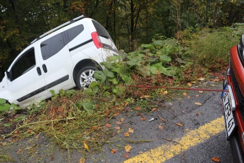 Kocaeli’nin kayak merkezi Kartepe yolunda kontrolden çıkan hafif ticari araç, bariyerleri parçalayarak şarampole devrildi. 1 kişinin yaralandığı kazada yoldan geçen bir sürücü, kaza yapan aracı uçuruma yuvarlanmaması için arazi aracının vincine bağladı.