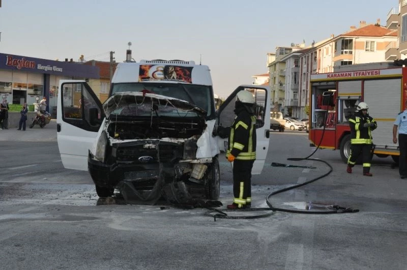 Karaman’da kamyonetle çarpıştıktan sonra alev alan servis minibüsündeki yangın itfaiye tarafından söndürüldü.