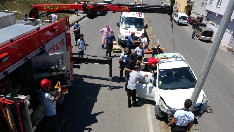 Kaza, Samsun’un İlkadım ilçesi Anadolu Mahallesi Korhan Ekiz Bulvarı üzerinde meydana geldi. Edinilen bilgiye göre, Sayime Ergün (45) idaresindeki 16 ABL 116 plakalı otomobil ile seyir halindeyken bir otomobilin sıkıştırması sonucu yoldan çıkarak duvar üzerinde ilerleyip demir aydınlatma direğine çarparak askıda kaldı. Kazada, otomobil sürücüsü Sayime Ergün ile yanında bulunan Çiğdem Er yaralandı. Otomobilin ön lastiği askıda kaldı ve aracın alt yola düşme ihtimali üzerine korku ve panik yaşandı. Yaralı sürücüsü Sayime Ergün’e sağlık ekipleri ilk müdahaleyi aracını içinde yaptı. Samsun Büyükşehir Belediyesi İtfaiye Daire Başkanlığı ekipleri, vinç yardımı ile aracı bulunduğu yerden yola çektikten sonra içindeki yaralı sürücü çıkartıldı. Kazada yaralanan 2 kadın, ambulanslarla Samsun Eğitim ve Araştırma Hastanesine kaldırıldı.