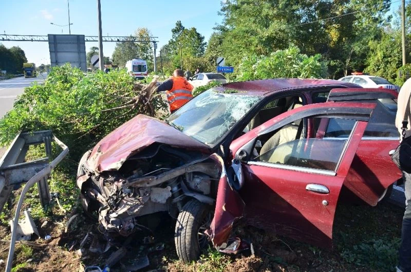 Alınan bilgiye göre, Terme ilçesinde Samsun-Ordu karayolunda seyir etmekte olan Soner Şahin’in kullandığı 16 AFH 615 plakalı otomobil, önündeki aracın aniden şerit değiştirmesiyle beraber sürücünün direksiyon hakimiyetini kaybetmesi sonucu refüje çıktı. Refüjdeki ağaçlara ve bariyerlere çarparak durabilen araç kullanılamaz hale gelirken, araç içerisindeki yolcular kazayı burunları bile kanamadan atlattı.