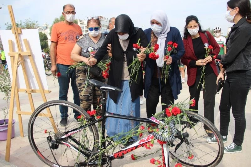 İzmir’de bisikletiyle antrenman yaparken kamyonun çarpması sonucu hayatını kaybeden Karşıyaka Belediyesi Gençlik ve Spor Kulübü Bisiklet Takımı sporcusu Zeynep Aslan, Bisikletli Yaşam Platformu tarafından anıldı. Aslan’ın bisikletine karanfil bırakılırken, gözyaşlarını tutamayan anne Nurten Aslan güçlükle ayakta durabildi.