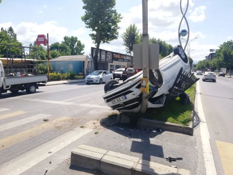 Sakarya’nın Adapazarı ilçesinde önündeki servis aracına çarpmamak için sürücüsünün manevra yaptığı otomobil, refüje çarparak ters döndü. Meydana gelen kazada sürücü yaralandı.