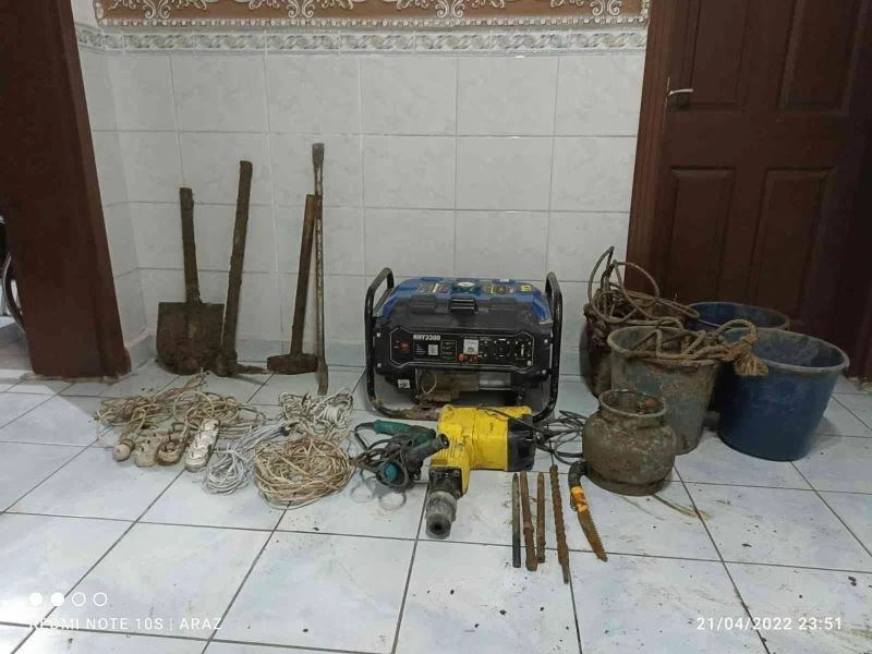 Edinilen bilgiye göre Derinkuyu ilçesi kırsalında kaçak kazı yapıldığı ihbarını alan jandarma ekipleri şahısların yakalanması için çalışma başlattı. Yapılan çalışmada kaçak kazı yaptıkları tespit edilen dört şahıs kaçak kazıda kullanılan, 1 adet jeneratör, 1 adet hilti, 1 adet matkap, 1 adet kazma, 1 adet kürek, 1 adet balyoz, 1 adet levye, 1 adet piknik tüpü1 adet plastik kova ve 1 adet testere ile birlikte suçüstü yakalandı.