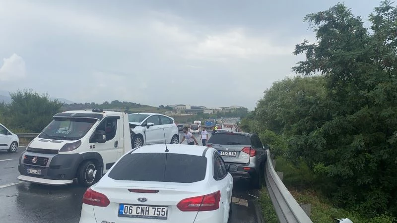 TEM Otoyolu Düzce mevkisinde 2 aracın karıştığı kazayı görenler frene basınca kayan önündeki araca vurdu. 3 ayrı kazada 8 araç birbirine girerken 1 kişi yaralandı.