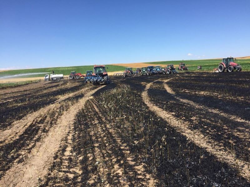 Köy Muhtarı Mustafa Karabulut; “Çalapvedi Köyünden Yusuf Budak’ın tarlasında elektrik kablosunun kopması ve şase sonrasında biçilmiş arpa tarlası firezlerinden başlayan yangın, ekili alanlara sıçradı. Yaklaşık 30 dekarlık ekili alan kül oldu. Üzüntümüz büyük. Köy muhtarlığından yaptığımız anons ile köylülerimiz harekete geçti. Ekin tarlasının yandığını haber alan köylülerimiz ellerine geçirdiği kazma ve küreklerle yangına müdahale etti.