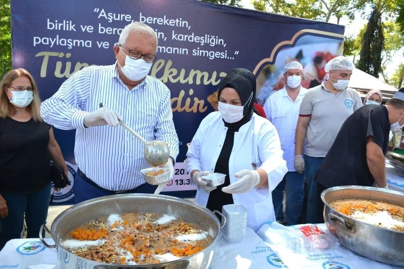 Mezarlıklar Müdürü Dr. Metin Avcı’nın okuduğu duanın ardından Başkan Posbıyık, Meclis üyeleri ve Başkan Yardımcıları kazanların başına geçerek vatandaşlara aşure dağıttı.