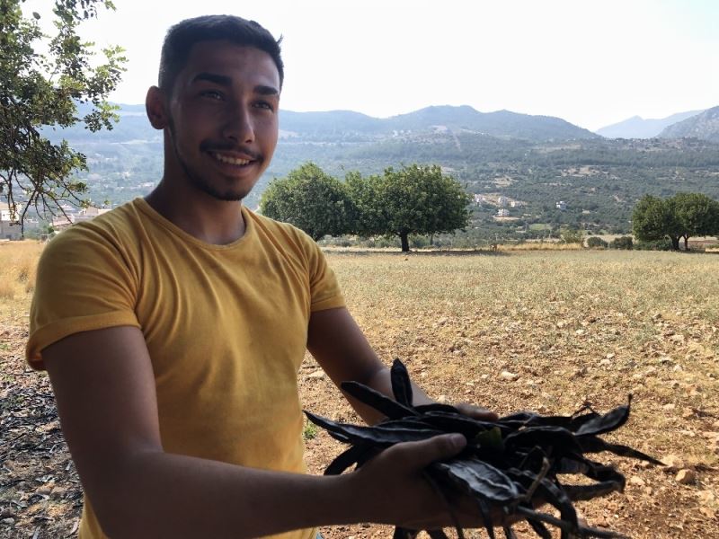 22 Temmuz’da hasadına başlanan ve kilosu 6 TL’den satılan keçiboynuzu için ağaçlarda hasat mesaisi yapan üreticilerden Bilgehan Tarhan, bu yıl 10 ağaçtan yaklaşık 1 ton ürün beklediklerini söyledi.