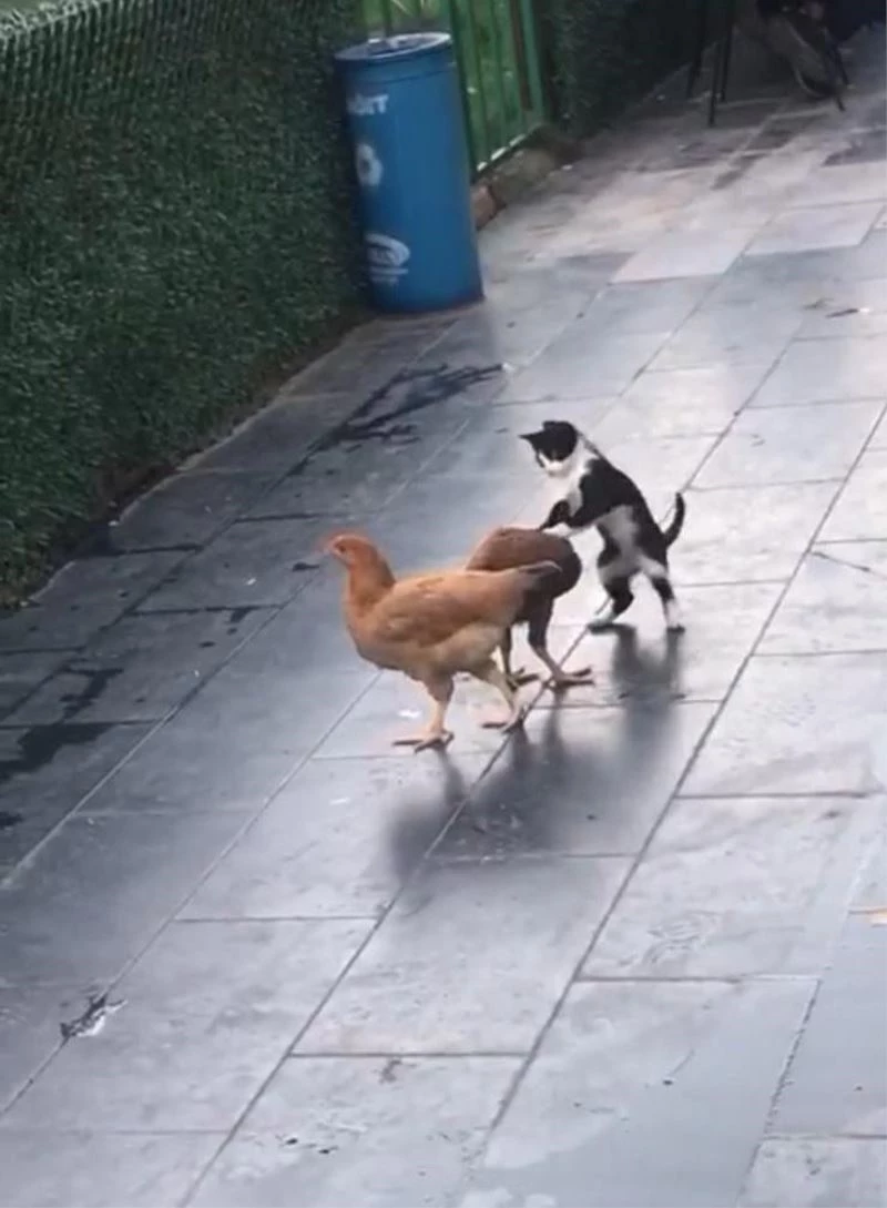 AK Parti Diyarbakır İl Başkanlığı bahçesinde hayvanlar için ayrılan yaşam alanında bir kedi ve iki tavuğun dostane oyunu görenleri gülümsetti. Kedinin can sıkıntısından tavukların boynuna atlayarak sarılmaya çalışması çevredekilerin cep telefonu kameralarına yansıdı. Görüntülerde iki tavuğun yanına gelen kedi, ön ayakları ile tavuklara sarılarak bir süre oynadıktan sonra yere yatıp değişik oyunlar oynadı.