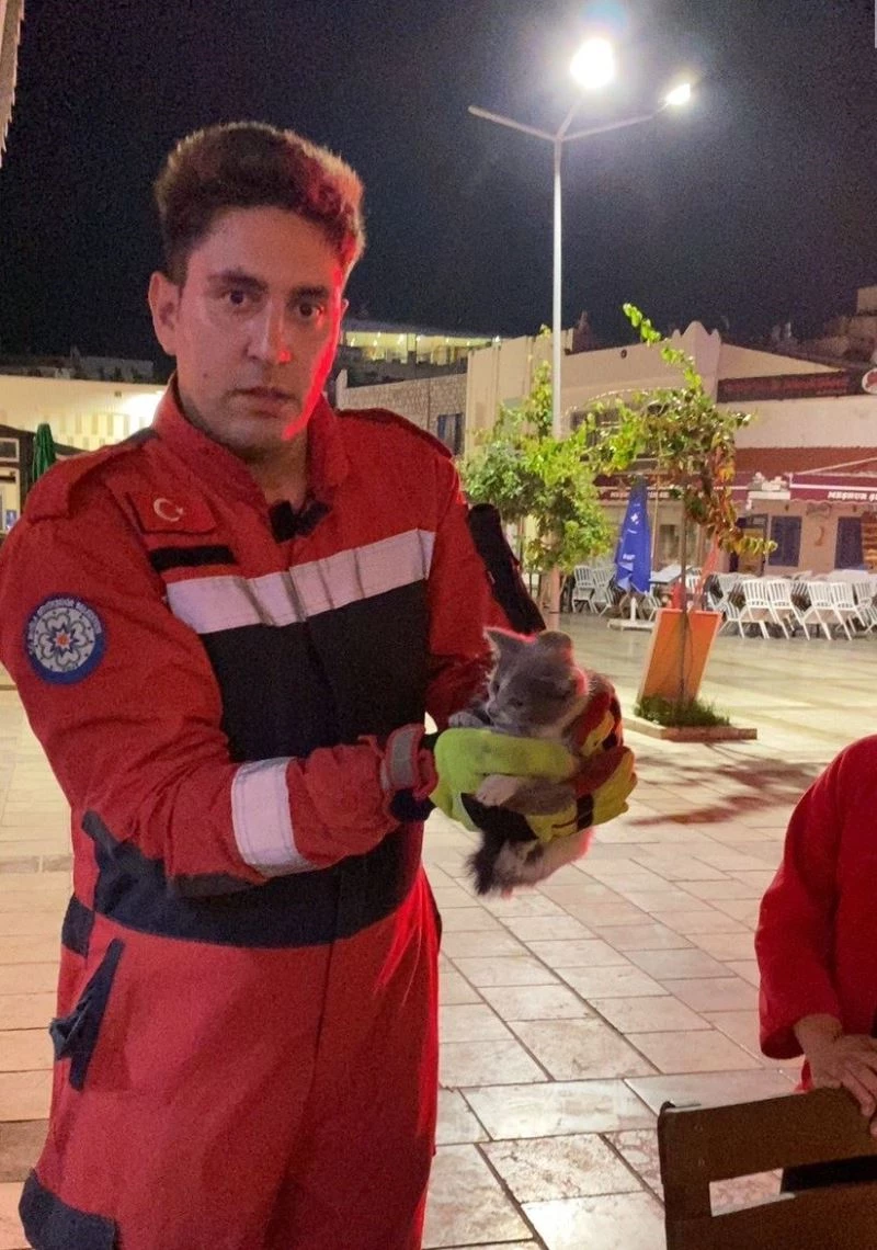 Bölgeye gelen Bodrum İtfaiye Grup Amirliği görevlileri, kediyi mahsur kaldığı yerden kurtardı. Kurtarılan kedi meydanda vatandaşların ilgi odağı oldu.