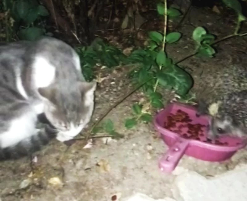 Kamil Akar, “ Bıraktığım mamayı kedimin yemesine fırsat vermeyen iki kirpi, bir haftadan bu yana gece saat 21.00-24 saatleri arasında bahçemde ortaya çıkıp kedimin mamalarını yedikten sonra gidiyorlar. Artık iyice alıştılar ve her gece geliyorlar. Kedim için aldığım 10 kilo mama önceden bir ay yetiyordu, mamadan kirpilerin de yemeye başlamasıyla bir haftada tükendi. Kirpiler yemleri yerken kedim de onları merakla izliyor ve onlara hiçbir şekilde zarar vermiyor. Mamasını kirpiler gittikten sonra yiyor. Onların mama yiyişlerini izlemek beni mutlu ediyor. Kirpiler gelmeye devam ettikçe onları beslemeyi sürdüreceğim” dedi.